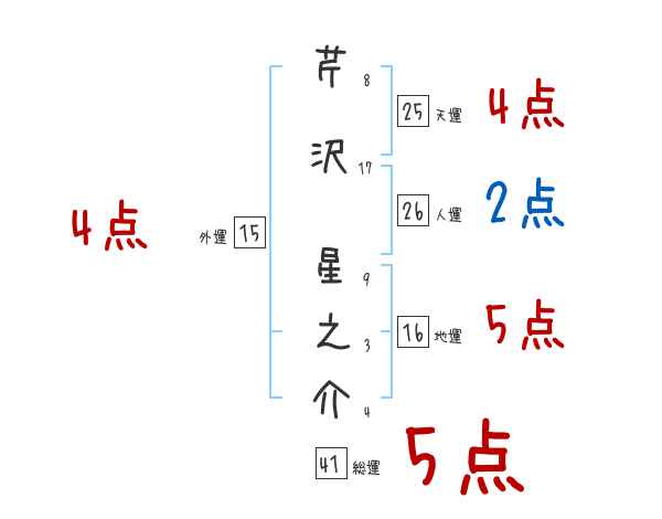 天運![]() | 芹沢星之介さんの天運は25画の4つ星!個性があり才能があふれる。強運の持ち主で発展する。 家系が持つ宿命的な運勢を表します。祖先から受け継いだ苗字ですので自分の力が及びません。家柄を象徴します。 |