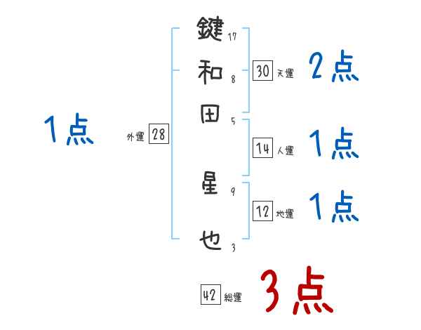 天運![]() | 鍵和田星也さんの天運は30画の2つ星!浮き沈みの激しさに注意しましょう。 家系が持つ宿命的な運勢を表します。祖先から受け継いだ苗字ですので自分の力が及びません。家柄を象徴します。 |