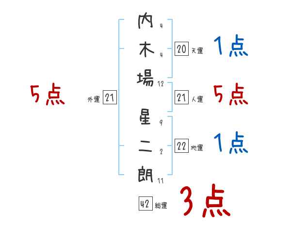 人運![]() | 内木場星二朗さんの人運は21画の5つ星!統率力がある。独立し成功する。名誉を手に入れる。 性格や才能などを表す2番目に重要な運勢です。人間関係や協調性、社会的な成功に影響します。主に20歳から50歳ぐらいまでの中年期の運勢を表します。 |
