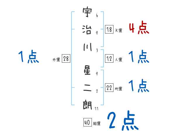地運![]() | 宇治川星二朗さんの地運は22画の1つ星!努力することが苦手ないっぽう手先が器用。芸術性にも優れる。 個性を表す基礎的な運勢です。性格形成や対人関係、行動力など家庭環境に影響されます。主に誕生してから20歳くらいまでの若年期の運勢を表します。 |