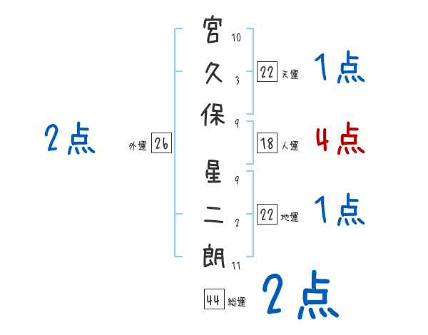 外運![]() | 宮久保星二朗さんの外運は26画の2つ星!波瀾万丈かも。信頼できる人を大事にしましょう。 生活面を象徴する運勢です。外部から受ける影響力を表し、結婚運、家庭運や職場、環境への順応性を表します。 |