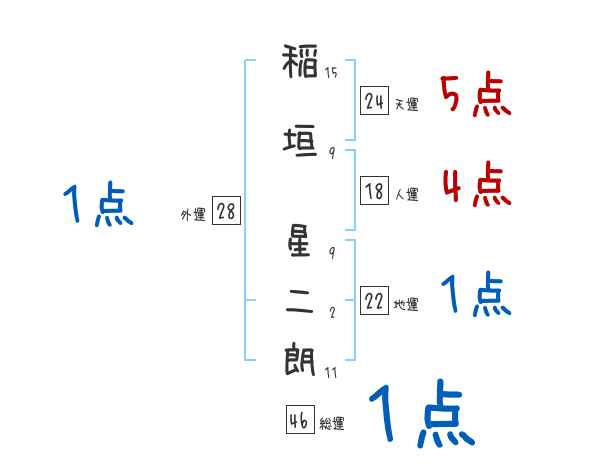 外運![]() | 稲垣星二朗さんの外運は28画の1つ星!家庭環境に注意。スポーツで活躍できる能力があるかも。 生活面を象徴する運勢です。外部から受ける影響力を表し、結婚運、家庭運や職場、環境への順応性を表します。 |