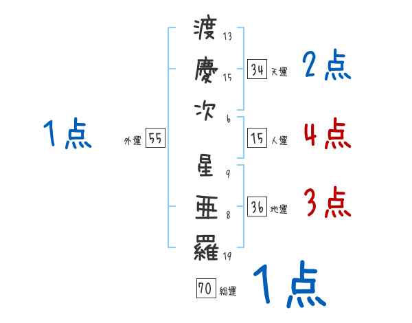 天運![]() | 渡慶次星亜羅さんの天運は34画の2つ星!独創性に優れるが、自尊心が強く災難に注意しましょう。 家系が持つ宿命的な運勢を表します。祖先から受け継いだ苗字ですので自分の力が及びません。家柄を象徴します。 |
