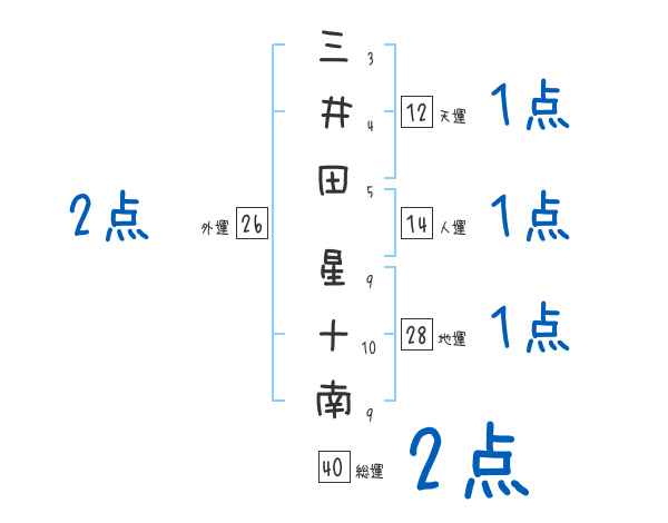 外運![]() | 三井田星十南さんの外運は26画の2つ星!波瀾万丈かも。信頼できる人を大事にしましょう。 生活面を象徴する運勢です。外部から受ける影響力を表し、結婚運、家庭運や職場、環境への順応性を表します。 |