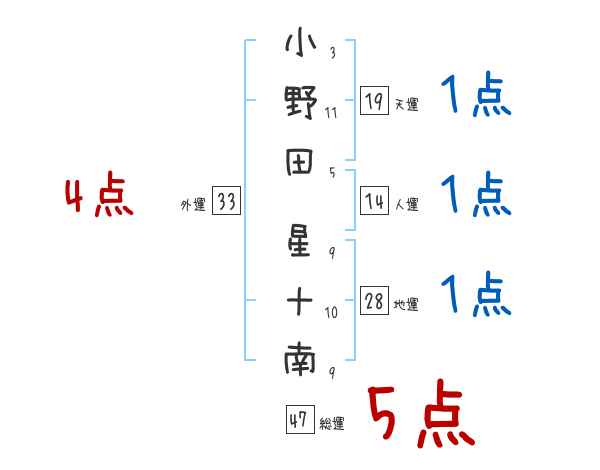 総運![]() | 小野田星十南さんの総運は47画の5つ星!実力が開花し発展する円満な人生。財に恵まれる。 あなたの人生を表す1番重要な運勢です。生涯を通じて影響する総合運となり、主に50歳以降の晩年期に影響を及ぼします。 |
