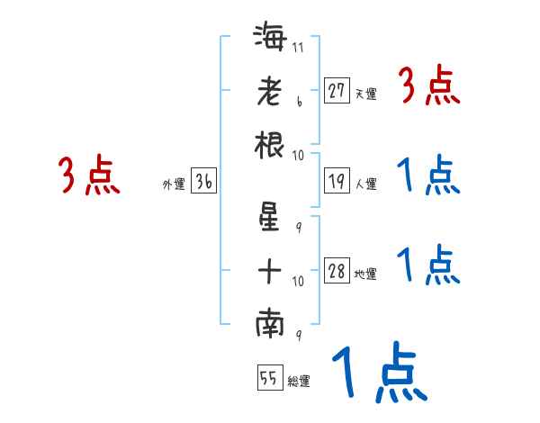外運![]() | 海老根星十南さんの外運は36画の3つ星!先見性が豊かです。多少神経質で苦労することも。 生活面を象徴する運勢です。外部から受ける影響力を表し、結婚運、家庭運や職場、環境への順応性を表します。 |
