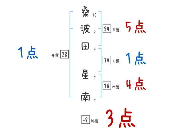 外運![]() | 桑波田星南さんの外運は28画の1つ星!家庭環境に注意。スポーツで活躍できる能力があるかも。 生活面を象徴する運勢です。外部から受ける影響力を表し、結婚運、家庭運や職場、環境への順応性を表します。 |