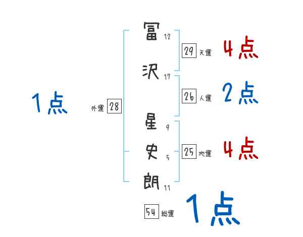 総運![]() | 冨沢星史朗さんの総運は54画の1つ星!トラブルが多いかも。周りをよく見て協調して過ごしましょう。 あなたの人生を表す1番重要な運勢です。生涯を通じて影響する総合運となり、主に50歳以降の晩年期に影響を及ぼします。 |