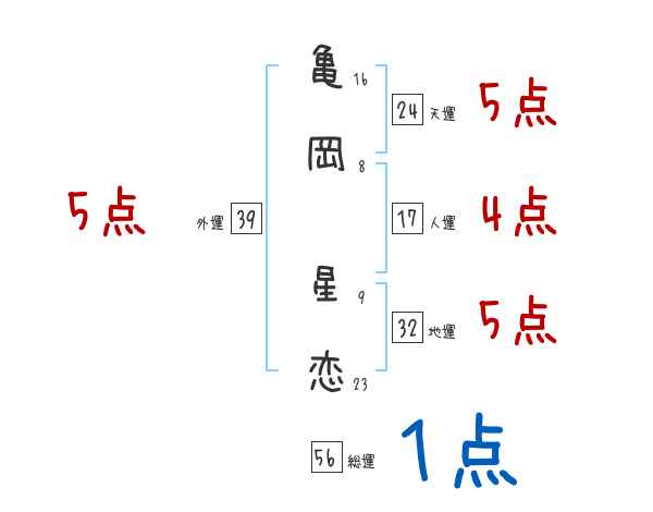 天運![]() | 亀岡星恋さんの天運は24画の5つ星!家庭運が良く順調な人生。金運にも恵まれる。 家系が持つ宿命的な運勢を表します。祖先から受け継いだ苗字ですので自分の力が及びません。家柄を象徴します。 |