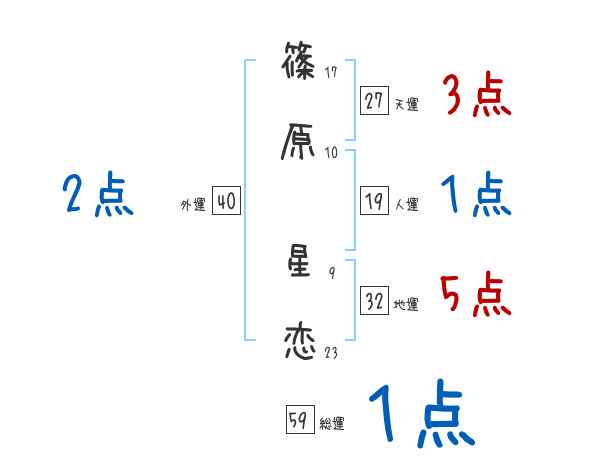 総運![]() | 篠原星恋さんの総運は59画の1つ星!意志の弱さであきらめることが多いかも。粘り強さが必要。 あなたの人生を表す1番重要な運勢です。生涯を通じて影響する総合運となり、主に50歳以降の晩年期に影響を及ぼします。 |