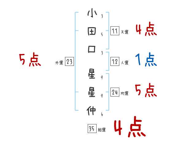 天運![]() | 小田口星星仲さんの天運は11画の4つ星!着実に富や地位を得る幸運な人生。 家系が持つ宿命的な運勢を表します。祖先から受け継いだ苗字ですので自分の力が及びません。家柄を象徴します。 |