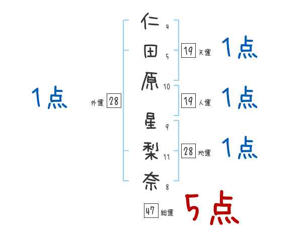 天運![]() | 仁田原星梨奈さんの天運は19画の1つ星!優れた才能を持ちますが、協調性が足りないことも。周りの人と協力する事を意識しましょう。 家系が持つ宿命的な運勢を表します。祖先から受け継いだ苗字ですので自分の力が及びません。家柄を象徴します。 |
