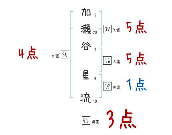 天運![]() | 加瀬谷星流さんの天運は32画の5つ星!柔軟性があり成功する。チャンスが多く金運が良い。 家系が持つ宿命的な運勢を表します。祖先から受け継いだ苗字ですので自分の力が及びません。家柄を象徴します。 |