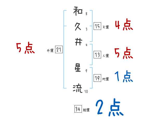 総運![]() | 和久井星流さんの総運は34画の2つ星!独創性に優れるが、自尊心が強く災難に注意しましょう。 あなたの人生を表す1番重要な運勢です。生涯を通じて影響する総合運となり、主に50歳以降の晩年期に影響を及ぼします。 |