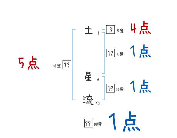 外運![]() | 土星流さんの外運は13画の5つ星!才能に恵まれ人気がある。名声を手に入れる。円満な人生。 生活面を象徴する運勢です。外部から受ける影響力を表し、結婚運、家庭運や職場、環境への順応性を表します。 |