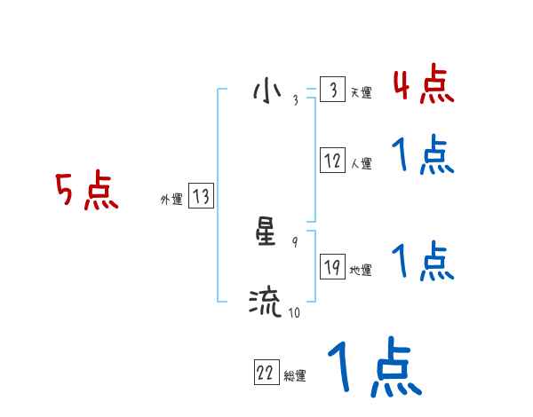 天運![]() | 小星流さんの天運は3画の4つ星!活動的で才能に恵まれ、多くの信頼を得る。希望に満ち成長する。 家系が持つ宿命的な運勢を表します。祖先から受け継いだ苗字ですので自分の力が及びません。家柄を象徴します。 |