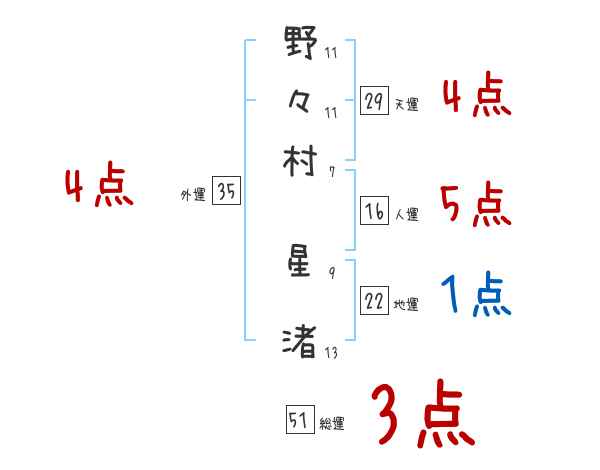 天運![]() | 野々村星渚さんの天運は29画の4つ星!完全主義で才能がある。厳格な心の持ち主。 家系が持つ宿命的な運勢を表します。祖先から受け継いだ苗字ですので自分の力が及びません。家柄を象徴します。 |