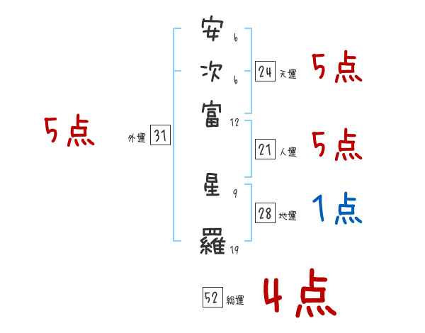 天運![]() | 安次富星羅さんの天運は24画の5つ星!家庭運が良く順調な人生。金運にも恵まれる。 家系が持つ宿命的な運勢を表します。祖先から受け継いだ苗字ですので自分の力が及びません。家柄を象徴します。 |