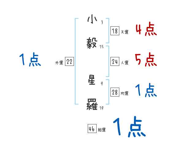 天運![]() | 小毅星羅さんの天運は18画の4つ星!情熱的で剛気。忍耐力があり信頼される。 家系が持つ宿命的な運勢を表します。祖先から受け継いだ苗字ですので自分の力が及びません。家柄を象徴します。 |