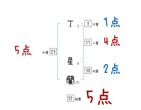 総運![]() | 丁星蘭さんの総運は32画の5つ星!柔軟性があり成功する。チャンスが多く金運が良い。 あなたの人生を表す1番重要な運勢です。生涯を通じて影響する総合運となり、主に50歳以降の晩年期に影響を及ぼします。 |