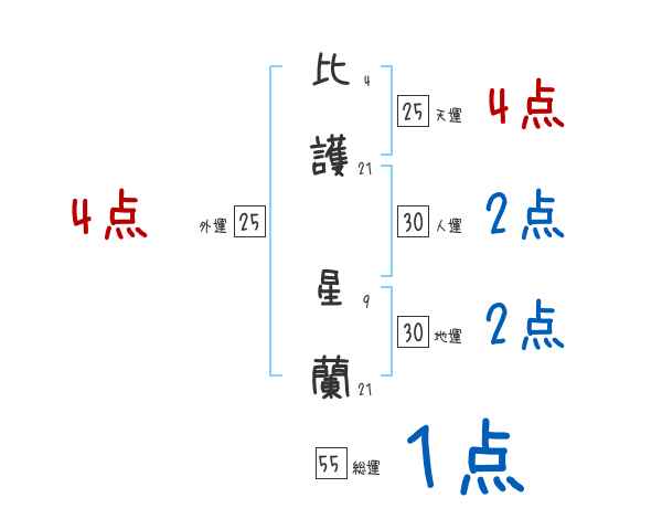 天運![]() | 比護星蘭さんの天運は25画の4つ星!個性があり才能があふれる。強運の持ち主で発展する。 家系が持つ宿命的な運勢を表します。祖先から受け継いだ苗字ですので自分の力が及びません。家柄を象徴します。 |
