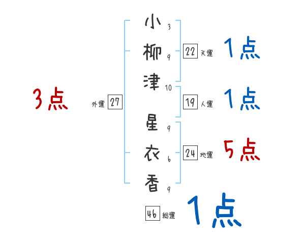 外運![]() | 小柳津星衣香さんの外運は27画の3つ星!頭脳明晰だが強情で摩擦が多い傾向。孤立に注意。 生活面を象徴する運勢です。外部から受ける影響力を表し、結婚運、家庭運や職場、環境への順応性を表します。 |