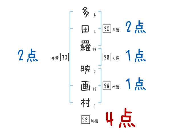 天運![]() | 多田羅映画村さんの天運は30画の2つ星!浮き沈みの激しさに注意しましょう。 家系が持つ宿命的な運勢を表します。祖先から受け継いだ苗字ですので自分の力が及びません。家柄を象徴します。 |