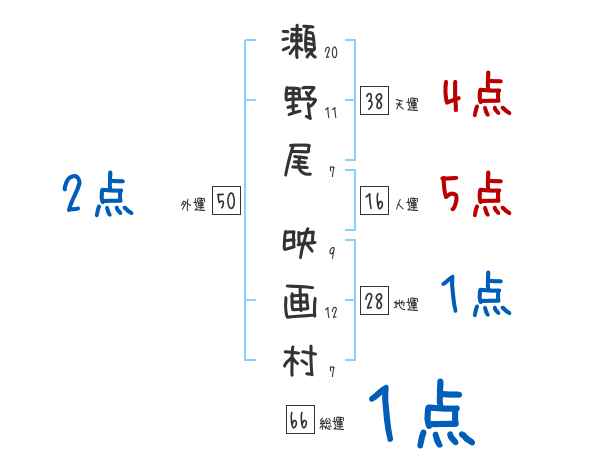 総運![]() | 瀬野尾映画村さんの総運は66画の1つ星!迷うことが多く挫折しやすい傾向が。辛抱強く物事に取り組みましょう。 あなたの人生を表す1番重要な運勢です。生涯を通じて影響する総合運となり、主に50歳以降の晩年期に影響を及ぼします。 |