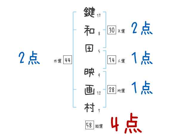 天運![]() | 鍵和田映画村さんの天運は30画の2つ星!浮き沈みの激しさに注意しましょう。 家系が持つ宿命的な運勢を表します。祖先から受け継いだ苗字ですので自分の力が及びません。家柄を象徴します。 |
