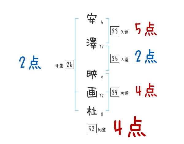 人運![]() | 安澤映画社さんの人運は26画の2つ星!波瀾万丈かも。信頼できる人を大事にしましょう。 性格や才能などを表す2番目に重要な運勢です。人間関係や協調性、社会的な成功に影響します。主に20歳から50歳ぐらいまでの中年期の運勢を表します。 |