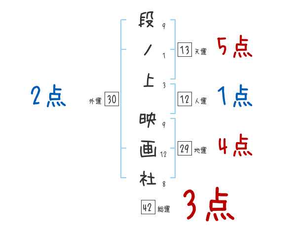 外運![]() | 段ノ上映画社さんの外運は30画の2つ星!浮き沈みの激しさに注意しましょう。 生活面を象徴する運勢です。外部から受ける影響力を表し、結婚運、家庭運や職場、環境への順応性を表します。 |
