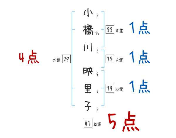 外運![]() | 小橋川映里子さんの外運は29画の4つ星!完全主義で才能がある。厳格な心の持ち主。 生活面を象徴する運勢です。外部から受ける影響力を表し、結婚運、家庭運や職場、環境への順応性を表します。 |