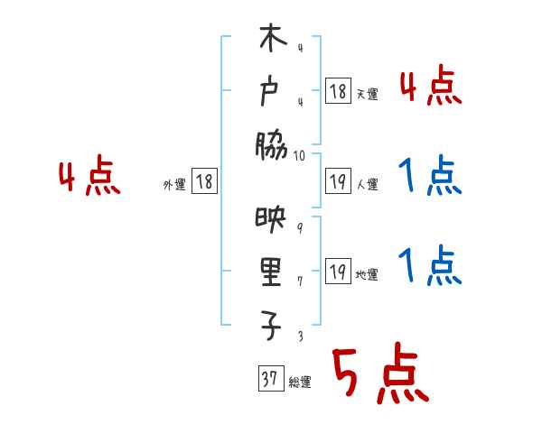 外運![]() | 木戸脇映里子さんの外運は18画の4つ星!情熱的で剛気。忍耐力があり信頼される。 生活面を象徴する運勢です。外部から受ける影響力を表し、結婚運、家庭運や職場、環境への順応性を表します。 |