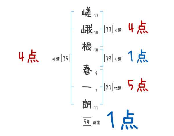 外運![]() | 嵯峨根春一朗さんの外運は35画の4つ星!温厚な性格で感受性が高い。穏和な性格で人望が厚い。 生活面を象徴する運勢です。外部から受ける影響力を表し、結婚運、家庭運や職場、環境への順応性を表します。 |