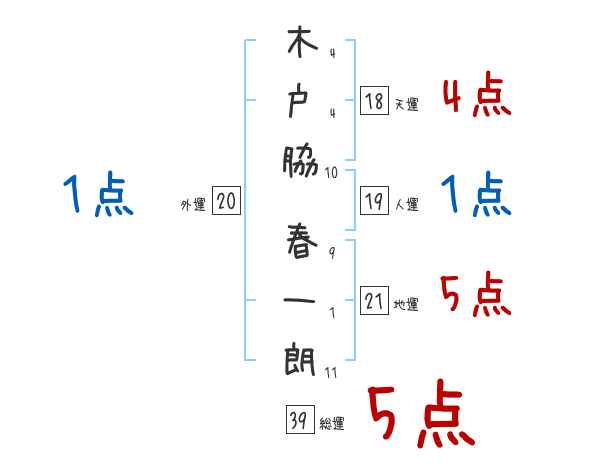 総運![]() | 木戸脇春一朗さんの総運は39画の5つ星!社交性に優れ人望が厚い。人の上に立ち成功する。 あなたの人生を表す1番重要な運勢です。生涯を通じて影響する総合運となり、主に50歳以降の晩年期に影響を及ぼします。 |