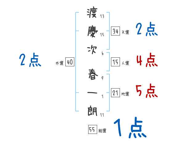 天運![]() | 渡慶次春一朗さんの天運は34画の2つ星!独創性に優れるが、自尊心が強く災難に注意しましょう。 家系が持つ宿命的な運勢を表します。祖先から受け継いだ苗字ですので自分の力が及びません。家柄を象徴します。 |