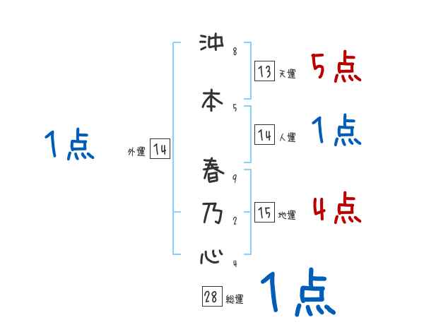 天運![]() | 沖本春乃心さんの天運は13画の5つ星!才能に恵まれ人気がある。名声を手に入れる。円満な人生。 家系が持つ宿命的な運勢を表します。祖先から受け継いだ苗字ですので自分の力が及びません。家柄を象徴します。 |