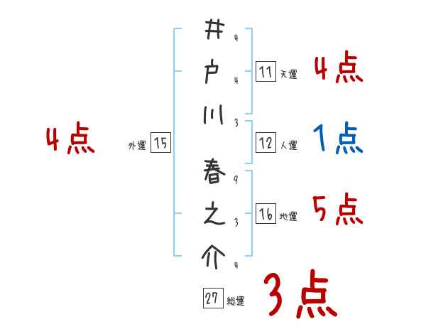 総運![]() | 井戸川春之介さんの総運は27画の3つ星!頭脳明晰だが強情で摩擦が多い傾向。孤立に注意。 あなたの人生を表す1番重要な運勢です。生涯を通じて影響する総合運となり、主に50歳以降の晩年期に影響を及ぼします。 |