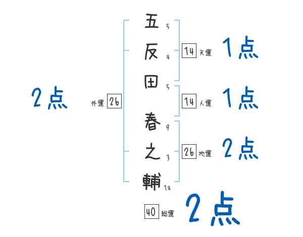 天運![]() | 五反田春之輔さんの天運は14画の1つ星!人に対して優しいがストレスを溜め込みがち。人間関係のトラブルを避けるよう気をつけましょう。 家系が持つ宿命的な運勢を表します。祖先から受け継いだ苗字ですので自分の力が及びません。家柄を象徴します。 |