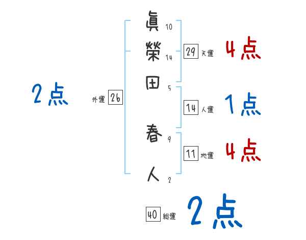 外運![]() | 眞榮田春人さんの外運は26画の2つ星!波瀾万丈かも。信頼できる人を大事にしましょう。 生活面を象徴する運勢です。外部から受ける影響力を表し、結婚運、家庭運や職場、環境への順応性を表します。 |