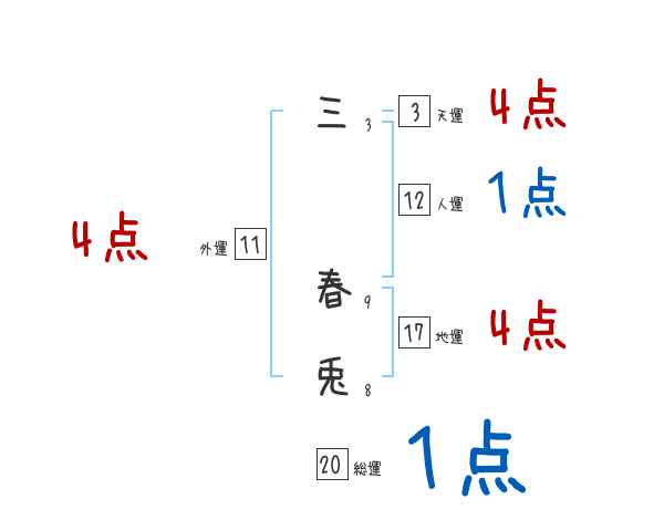 天運![]() | 三春兎さんの天運は3画の4つ星!活動的で才能に恵まれ、多くの信頼を得る。希望に満ち成長する。 家系が持つ宿命的な運勢を表します。祖先から受け継いだ苗字ですので自分の力が及びません。家柄を象徴します。 |