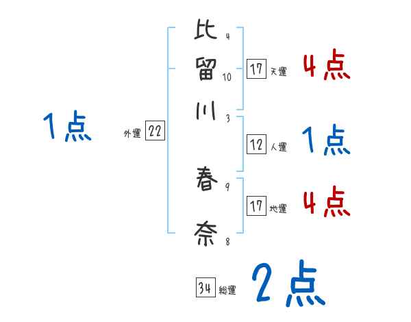 総運![]() | 比留川春奈さんの総運は34画の2つ星!独創性に優れるが、自尊心が強く災難に注意しましょう。 あなたの人生を表す1番重要な運勢です。生涯を通じて影響する総合運となり、主に50歳以降の晩年期に影響を及ぼします。 |