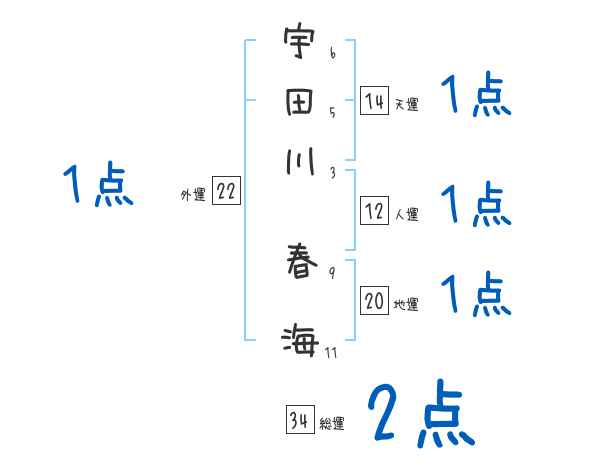 天運![]() | 宇田川春海さんの天運は14画の1つ星!人に対して優しいがストレスを溜め込みがち。人間関係のトラブルを避けるよう気をつけましょう。 家系が持つ宿命的な運勢を表します。祖先から受け継いだ苗字ですので自分の力が及びません。家柄を象徴します。 |