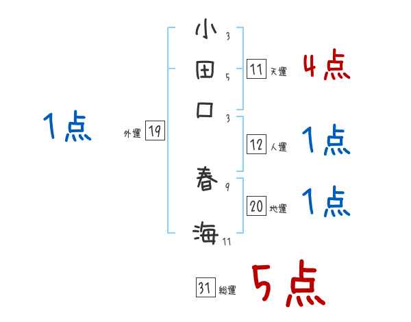 外運![]() | 小田口春海さんの外運は19画の1つ星!優れた才能を持ちますが、協調性が足りないことも。周りの人と協力する事を意識しましょう。 生活面を象徴する運勢です。外部から受ける影響力を表し、結婚運、家庭運や職場、環境への順応性を表します。 |