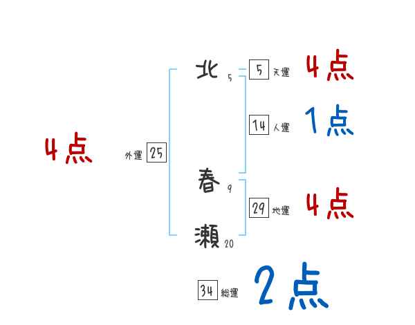総運![]() | 北春瀬さんの総運は34画の2つ星!独創性に優れるが、自尊心が強く災難に注意しましょう。 あなたの人生を表す1番重要な運勢です。生涯を通じて影響する総合運となり、主に50歳以降の晩年期に影響を及ぼします。 |