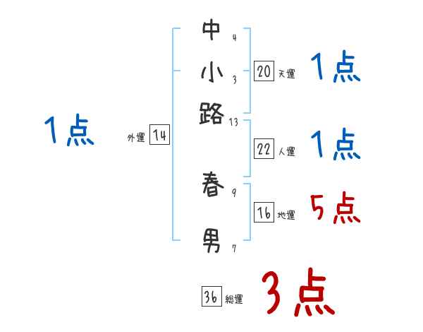 外運![]() | 中小路春男さんの外運は14画の1つ星!人に対して優しいがストレスを溜め込みがち。人間関係のトラブルを避けるよう気をつけましょう。 生活面を象徴する運勢です。外部から受ける影響力を表し、結婚運、家庭運や職場、環境への順応性を表します。 |