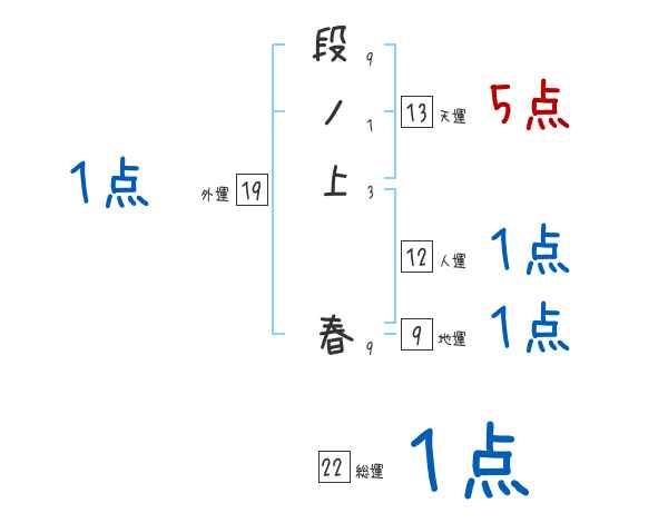 外運![]() | 段ノ上春さんの外運は19画の1つ星!優れた才能を持ちますが、協調性が足りないことも。周りの人と協力する事を意識しましょう。 生活面を象徴する運勢です。外部から受ける影響力を表し、結婚運、家庭運や職場、環境への順応性を表します。 |