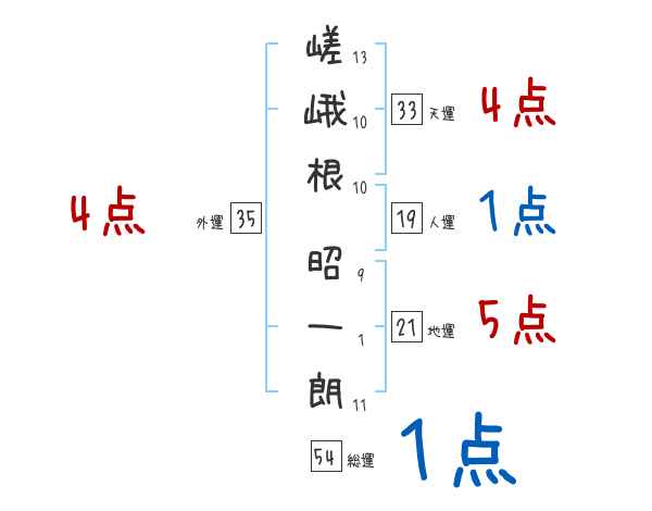 外運![]() | 嵯峨根昭一朗さんの外運は35画の4つ星!温厚な性格で感受性が高い。穏和な性格で人望が厚い。 生活面を象徴する運勢です。外部から受ける影響力を表し、結婚運、家庭運や職場、環境への順応性を表します。 |