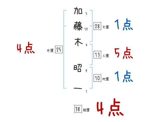 天運![]() | 加藤木昭一さんの天運は28画の1つ星!家庭環境に注意。スポーツで活躍できる能力があるかも。 家系が持つ宿命的な運勢を表します。祖先から受け継いだ苗字ですので自分の力が及びません。家柄を象徴します。 |