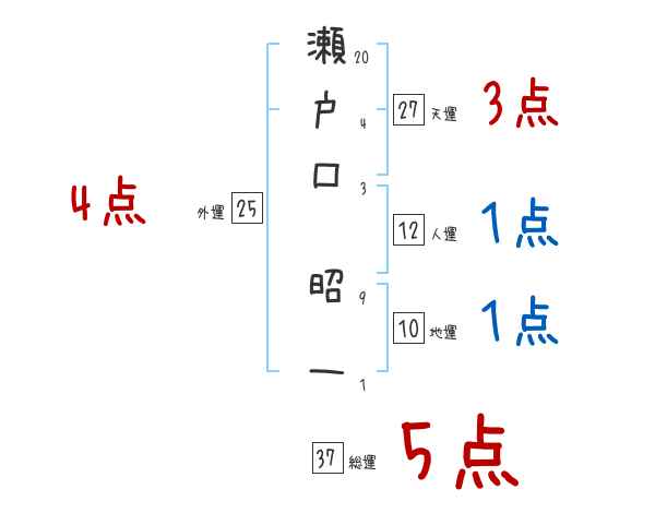 天運![]() | 瀬戸口昭一さんの天運は27画の3つ星!頭脳明晰だが強情で摩擦が多い傾向。孤立に注意。 家系が持つ宿命的な運勢を表します。祖先から受け継いだ苗字ですので自分の力が及びません。家柄を象徴します。 |